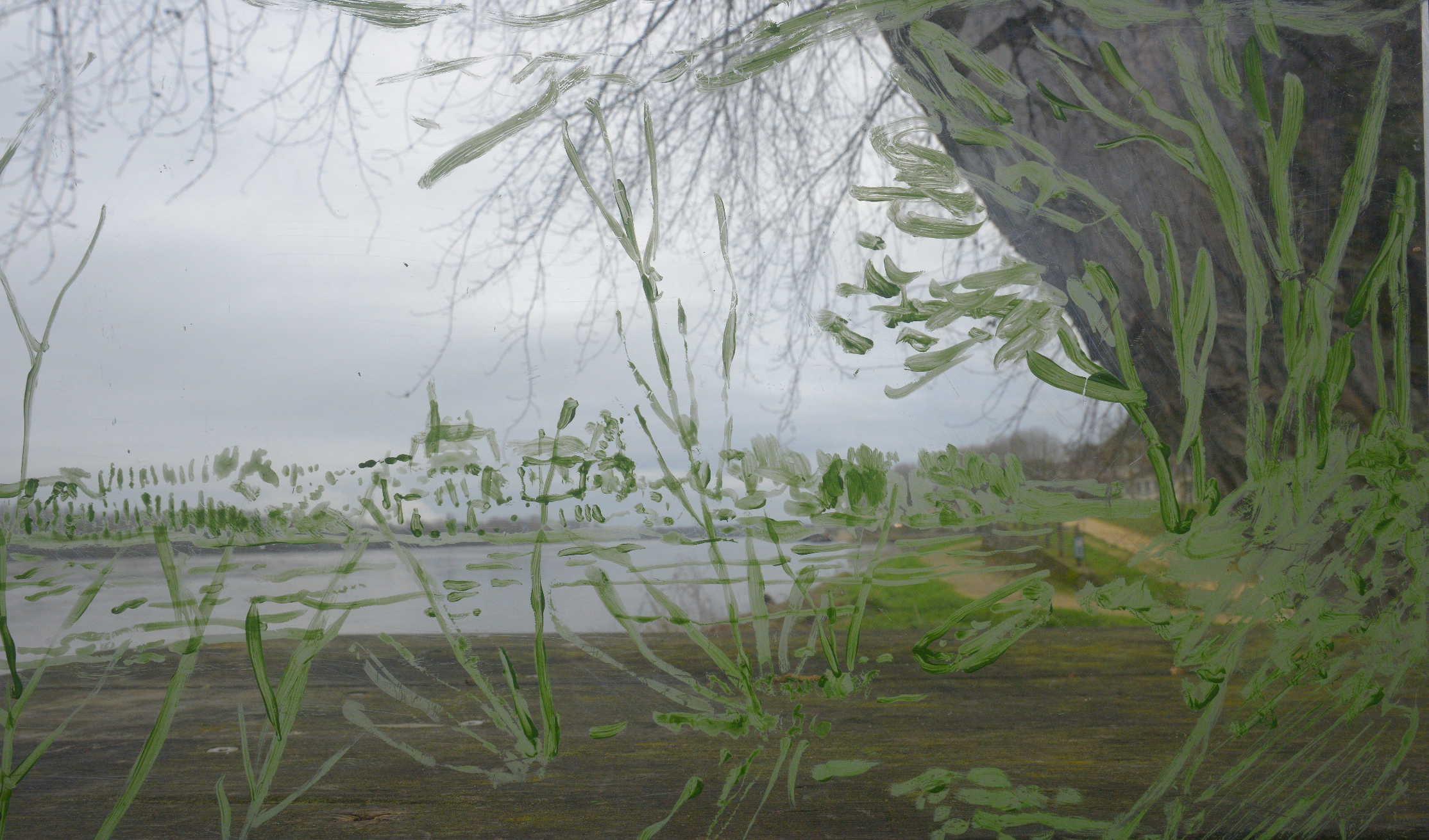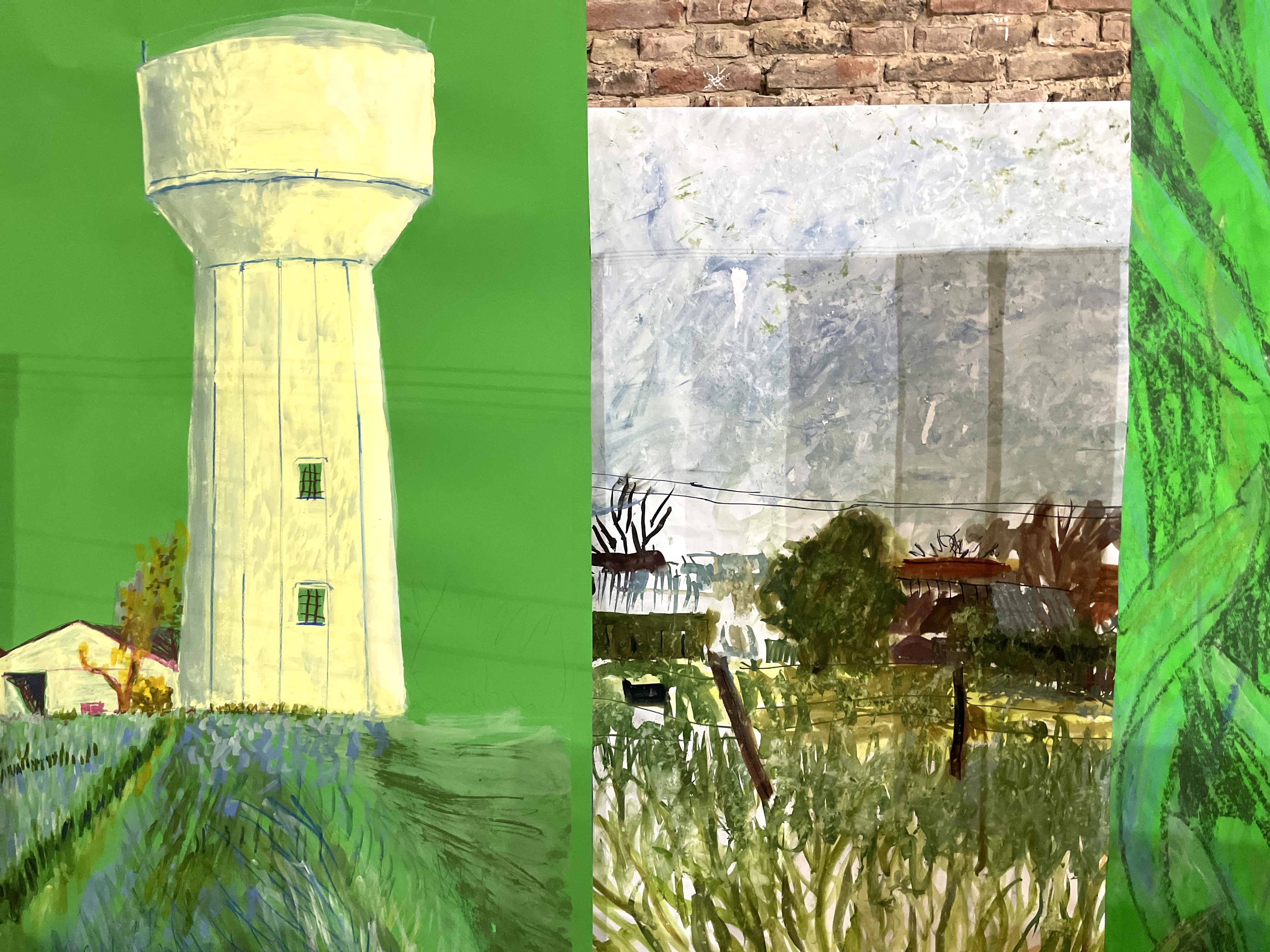 Jérôme Barbe procède à ce qu'il appelle des jeux rétiniens. L'un consiste à inventer un langage de paysage. Les gestes graphiques de l'atelier flottant composent un glossaire agencé selon une grammaire qui autorise la modularité. La ligne d'horizon devient ligne d'écriture. Les dessins sur verre superposent des points de vue fragmentés, entrecoupés d'une ponctuation d'aplats jaunes qui rythment l'ensemble. Acrylique sur verre, tablettes, dimensions variables.