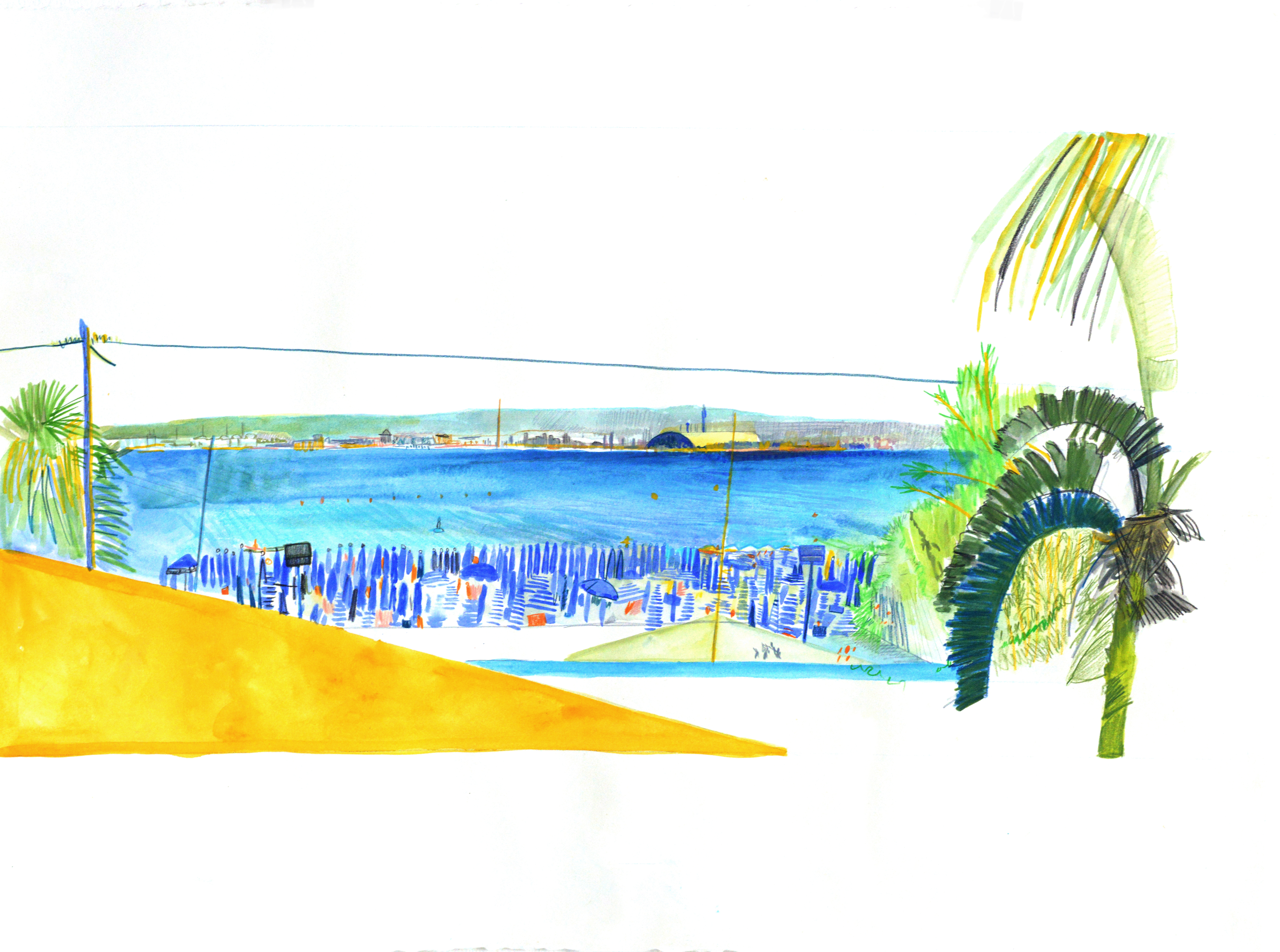 La série Tarente est dessinée du 7 au 9 aout 2019 sur la table de déjeuner d’une maison qui offrait une vue sur le complexe sidérurgiqueILVA (plus grosse production de dioxine en Italie), une raffinerie Shell et la plage privée d’Arenile di San Vito. Cette série explore à travers la tension entre loisir balnéaire et installations industrielles côtières – chacun possédant des qualités esthétiques indéniables –